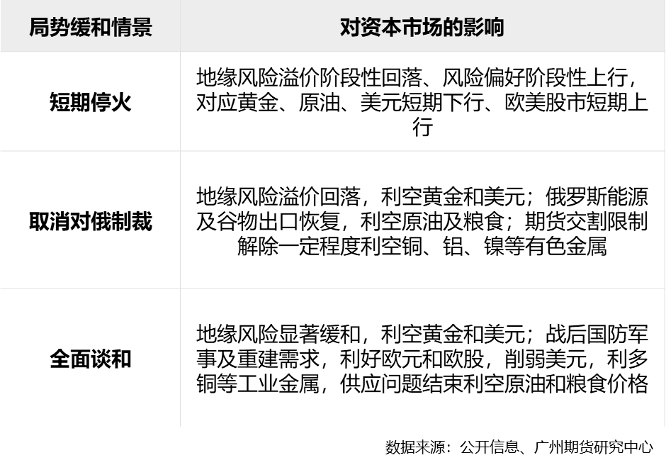 如上文所述,三方诉求复杂,谈判进展缓慢,短期达成停火可能性不高。同理,若局势“意外”缓和,则将对相关资产形成方向性的事件驱动影响,可能包括短期地缘风险溢价回落带来的黄金、美元下行、欧美风险情绪提振等,中期的供给问题缓解、俄罗斯出口恢复带来原油、粮食、有色供给增加,长期乌克兰战后重建背后的工业需求等。但具体供给影响需分场景分析,不同板块及品种的供需格局较俄乌冲突发生前亦有变化。