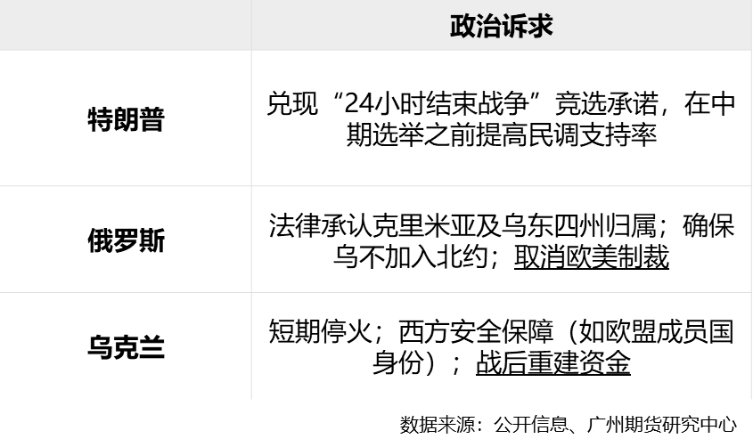从政治诉求看,特朗普为兑现“24小时结束战争”竞选承诺,在中期选举之前提高民调支持率,俄罗斯聚焦领土问题,乌克兰聚焦安全保障问题,但俄乌对于经济的相关诉求或成为本轮谈判的实质破局议题。